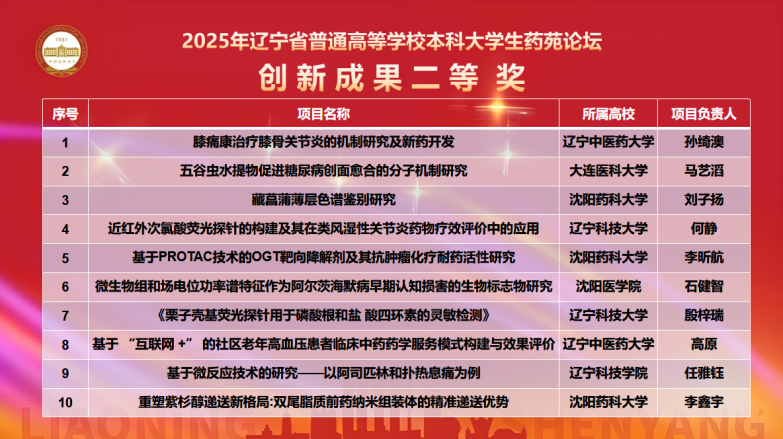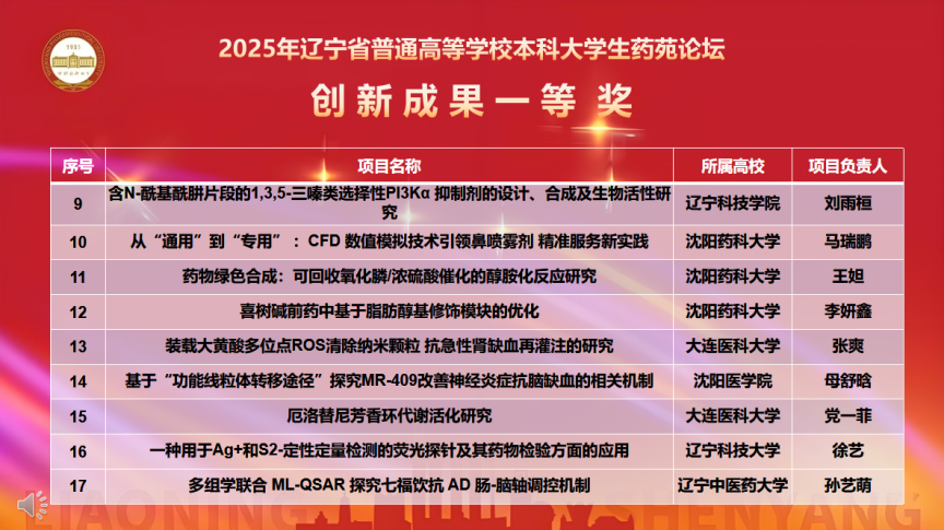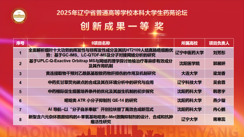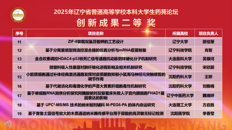 11月7日,由辽宁省教育厅主办、365beat体育官网承办的“2025年辽宁省普通高等学校本科大学生药苑论坛”在南校区图书馆国为报告厅举行。本次论坛吸引了来自大连理工大学、辽宁大学、大连医科大学等15所兄弟院校的500余名师生参赛,充分彰显了辽宁药学教育领域的蓬勃活力与深厚底蕴。山东大学、大连理工大学、辽宁大学、大连医科大学、365beat体育官网、辽宁中医药大学、沈阳医学院的专家出席论坛并对参赛项目进行现场评审。