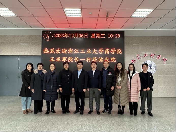 12月6日,浙江工业大学药学院院长王亚军、副院长谢媛媛、副院长李行诺、学院党委副书记乔婧芳、学科办副主任楚楚、学院办公室主任高丽萍一行6人来到365beat进行访问,就推动双方开展绿色制药协同创新进行调研。学院院长刘洋、院党委书记李哲、药学院副院长赵云丽、有机教研室教师任旭红、药物化学教研室教师吴成军参加了调研座谈。