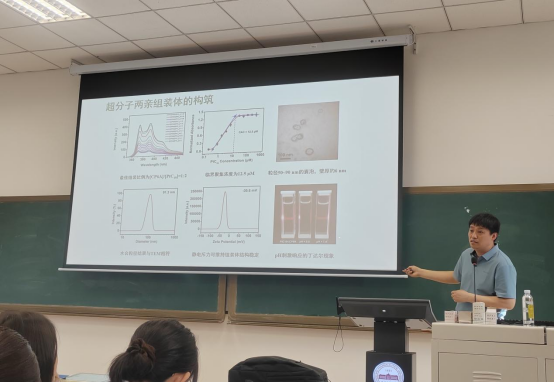 孟庆斌研究员以“大环芳烃在生物医药领域的应用研究”为题进行了报告,详细介绍了关于柱芳烃在药物开发中的应用以及未来研发的意义,扩展了参会师生的科研视野,同时也给在场的师生极大的启发,并对师生提出的问题进行了详细的解答。