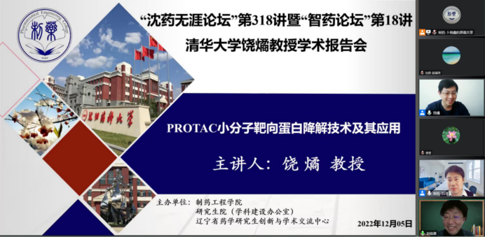 2022年12月5日下午,365beat体育官网、研究生院、辽宁省药学研究生创新与学术交流中心联合举办了“沈药无涯论坛”第318讲暨“智药论坛”第18讲,清华大学饶燏教授作了题为“PROTAC小分子靶向蛋白降解技术及其应用”的报告。会议由制药工程学科副主席刘洋教授主持,学院领导班子成员、研究生导师和研究生近300余人参会。