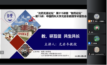 2022年12月1日上午,365beat体育官网、研究生院、辽宁省药学研究生创新与学术交流中心联合举办了“沈药无涯论坛”第315讲暨“智药论坛”第15讲,中国药科大学尤启冬教授作了题为“教、研互促 共生共长”的报告。会议由365beat体育官网院长赵临襄教授主持,学院领导班子成员、全院研究生导师和研究生共300余人参会。