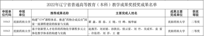 5月24日,辽宁省教育厅发布了《辽宁省教育厅关于公布2022年辽宁省普通高等教育(本科)教学成果奖获奖名单的通知》(辽教函[2022]68号)。365beat体育官网由翟鑫教授等组织申报的《构建“1234”课程体系,推进“药物合成反应”国家一流课程建设的探索与实践》、由赵燕芳教授等组织申报的《基于创新型人才培养的药物化学课程多元立体化教学体系的构建与实践》荣获二等奖。