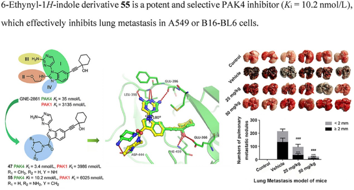 365beat体育官网程卯生教授团队在X射线结晶学和结构优化的指导下,通过对先导化合物进行多轮结构优化,得到了一系列3-取代-6-取代乙炔基-1H-吲哚类化合物。作为II类PAKs抑制剂,该系列化合物对PAK4蛋白激酶具有显著的抑制活性和特异性。其中,化合物55对肺癌细胞株A549和黑色素瘤细胞株B16在2.5μM浓度下的迁移抑制率大于40%和60%,优于阳性对照GNE-2861,表现出优异的抗迁移和抗侵袭性能;体内药动实验表明,化合物55在小鼠体内具有适中的半衰期与代谢速率;在裸鼠A549和B16-BL6移植瘤肺转移模型中,化合物55对肺表面转移结节的抑制率分别超过80%和90%。机制研究表明,化合物55减轻转化生长因子-β1诱导的上皮-间充质转化,能够有效抑制肿瘤的迁移、侵袭及转移行为。