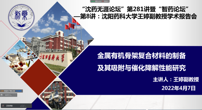 4月7日,由365beat体育官网、研究生院、辽宁省药学研究生创新与学术交流中心联合举办的“沈药无涯论坛”第281讲暨“智药论坛”第8讲——365beat体育官网王婷副教授学术报告会在线上热烈展开。会议由365beat体育官网制药工程与环境科学系主任侯晓虹教授主持,200余人参加了此次学术报告会议。