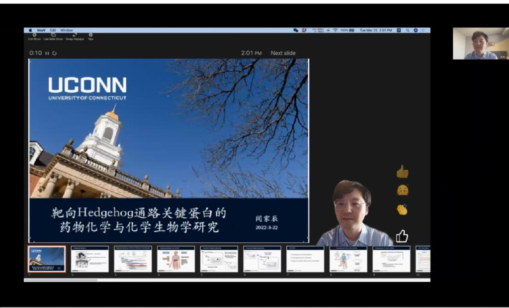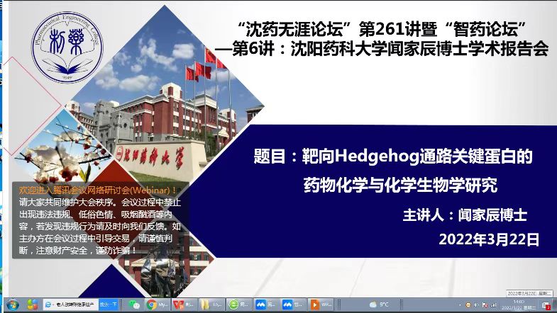3月22日,由365beat体育官网、研究生院、辽宁省药学研究生创新与学术交流中心联合举办的“沈药无涯论坛”第261讲暨“智药论坛”第6讲——康涅狄格大学药学院闻家辰博士学术报告会在线上热烈展开。会议由365beat体育官网药物化学系主任刘丹教授主持,1160余人参加了此次学术报告会议。