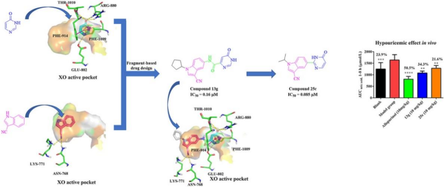 课题组前期研究发现嘧啶类XO抑制剂具较大的潜力,采用FBDD策略设计了一系列吲哚-嘧啶衍生物,其中化合物13g和25c展现出了较好的体外活性,IC50值分别为0.16μM和0.085μM,均在10mg/kg剂量下显著降低大鼠血清尿酸水平,具有后续研究的潜力。另一方面,在嘧啶类XO抑制剂TMC-5的基础上,通过破坏分子内氢键和基于分子内氢键的骨架跃迁这两种策略,分别设计了嘧啶羧酸系列和嘧啶并吡唑酮系列化合物,其中优选化合物15a和19a表现出显著的体外和体内活性,为XO抑制剂的研究提供了新思路。