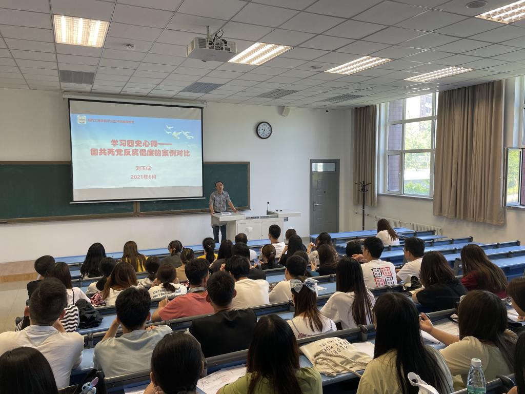 刘玉成分享了题目为《学习四史心得——国共两党反腐倡廉的案例对比》的专题党课。讲解中,通过三对典型案例的对比,分析了国民党和共产党在反腐倡廉问题上的不同态度和不同结果,阐述了共产党为什么“能”,警示各位毕业生党员要明理、增信、崇德、立行,引导毕业生党员从党史学习中激发信仰、获得启发、汲取力量,不断坚定“四个自信”,提升党性修养,树立廉洁价值理念,增强廉洁意识,培养廉洁操守,自觉提高拒腐防变的免疫力,展现沈药学子良好风采,不忘初心、牢记使命,成为一名社会主义合格建设者和可靠接班人,为祖国医药事业贡献自己的力量。