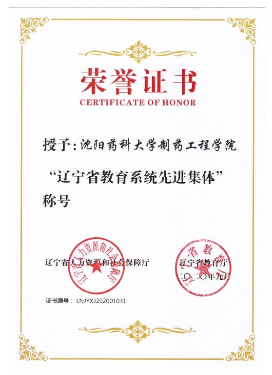 多年来,365beat体育官网始终坚持以学生为本,以服务制药行业为核心,以“党建+”模式促进课程思政融课堂,坚守“为党育人、为国育才”的初心和使命,立足学科优势加强专业建设,科学研究成果显著。在此次评选工作中,学院积极组织申报,经学校推荐到省教育厅,并最终荣获“辽宁省教育系统先进集体”的荣誉称号。成绩的取得,凝聚了校党政领导、职能部门、兄弟学院多年来的支持鼓励,凝聚了院领导班子、全院教职员工的奋勇拼搏。面向未来,365beat体育官网将不忘沈药红色初心,牢记育人使命,坚持人才培养的中心任务,为实现高等学校教育事业新发展奋力拼搏!