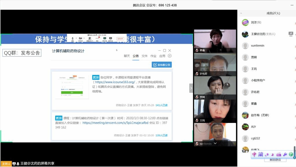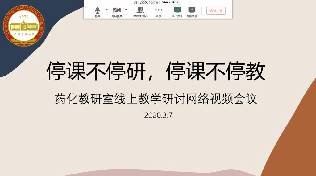 在新冠肺炎疫情防控工作的关键时期,365beat体育官网药物化学教研室积极响应教育部和校党委关于“停课不停教,停课不停学”的号召,于3月7日上午应用腾讯会议平台,召开网络视频工作会议,切实落实学校关于“扎实做好线上教学工作”的总体要求,研讨本科生理论课程网络教学的相关要点。会议由教研室主任刘丹教授主持,教研室26位一线教师全部出席会议。