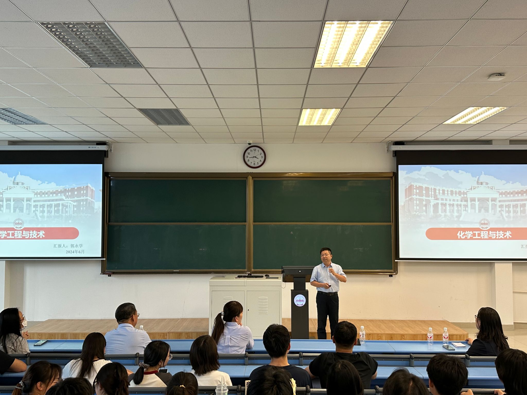 郭永学副院长带领同学们走进化学工程与技术学科:学科以化学工程技术为手段,研究药品、精细化学品、食品保健品等生产过程和三废治理的关键技术,形成以化学制药过程研究为主的药物合成、工艺优化、中试研发、三废处理、生物分离等制药工程全产业链的学科特色。他介绍了学科的科研团队、科研平台及相关研究内容,帮助同学们了解制药精微世界的工程学科独特的发展方向。通过聆听讲解,同学们更加清晰地了解了化学工程与技术学科的科研与就业前景。