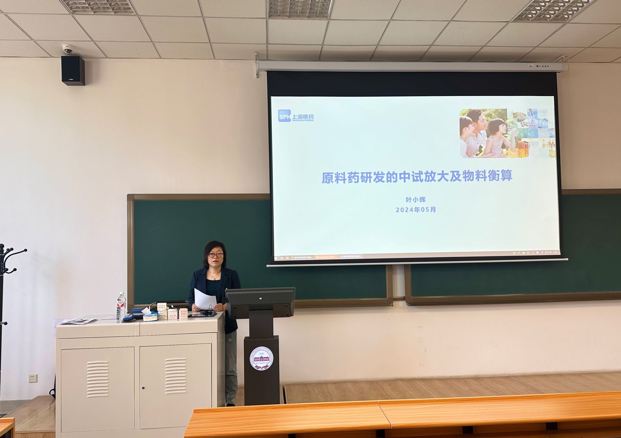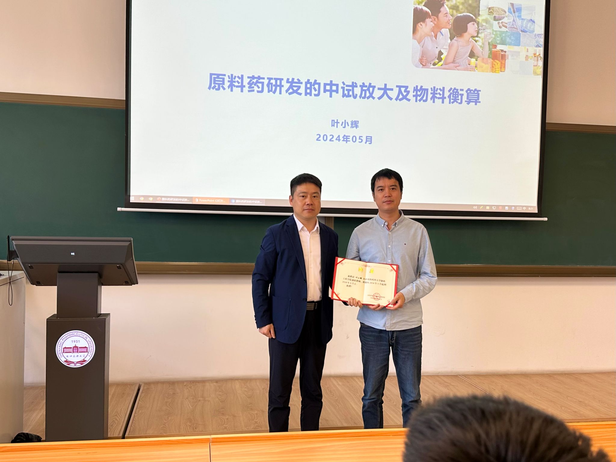 叶小辉为同学们作《原料药研发的中试放大及物料衡算》授课,他结合自己丰富的工作经验,从中试放大概述、中试研究方法、试放大常见问题及实施案例、安全风险评估、物料衡算几个方面为同学们作详细讲授。帮助同学们加强了对生产过程的实践认识,加深了对书本中理论知识的理解,明白了理论同实践结合的方式方法,熟悉了制药行业的工作内容与具体实操。